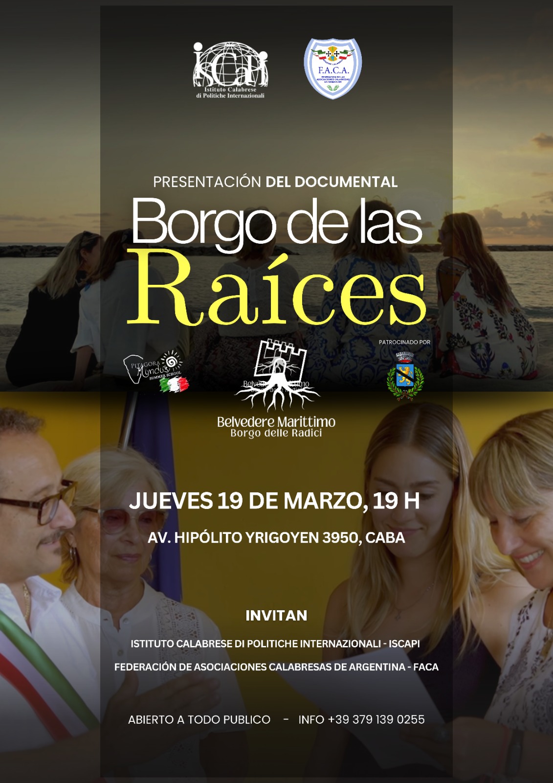 La proyección de “Borgo de las Raíces” se realizará el jueves 19 de marzo a las 19 hs, en la sede de la Federación de Asociaciones Calabresas de Argentina (FACA), ubicada en Av. Hipólito Yrigoyen 3950 (CABA). Cabe aclarar que el Dr. Salvatore La Porta (Presidente de IsCaPI) arriba a Buenos Aires, desde Calabria, especialmente para el estreno mundial del film. No solo presentará el documental sino que además participará de la conversación, posterior a la proyección, junto a los protagonistas y autoridades invitadas. De esta manera, los asistentes podrán revivir sus orígenes y serán partícipes de un espacio de diálogo y reflexión sobre identidad, memoria y raíces.