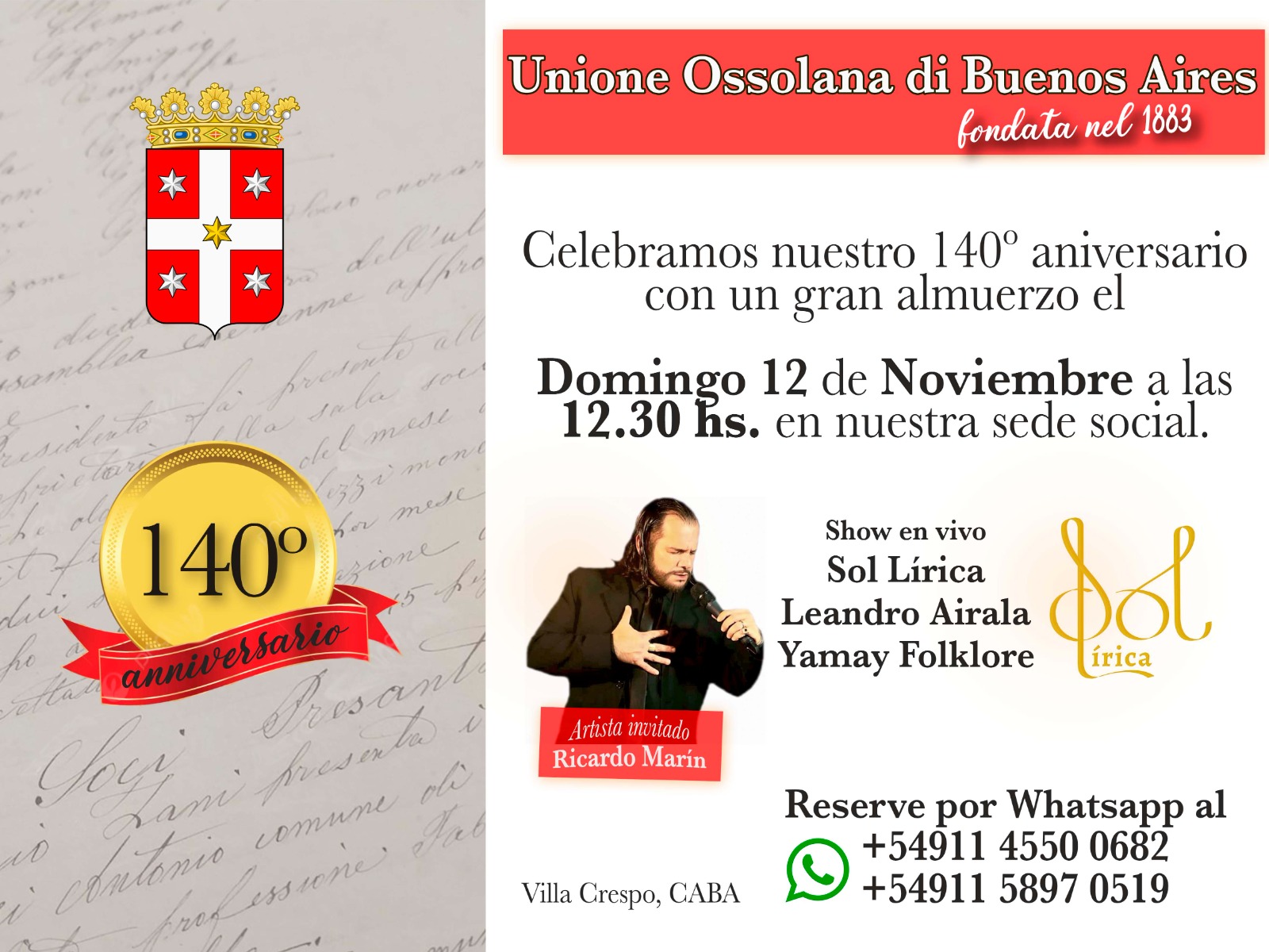 La Unione Ossolana di Buenos Aires celebra su 140° aniversario con un almuerzo el día 12 de noviembre. ¿Dónde? En la sede social, cita en la calle Darwin 950. Además de la gastronomía típica, los invitados podrán disfrutar del show en vivo a cargo de Sol Lírica, Leandro Airala y Yamay Folklore. Asimismo, el aniversario contará con la presencia de Ricardo Marín, como artista invitado. ¿Cómo podés reservar tu entrada? A través del contacto de Whatsapp: 1145500682 o 1158970519. ¡Vení a disfrutar de este gran almuerzo italiano junto a la Unione Ossolana di Buenos Aires!