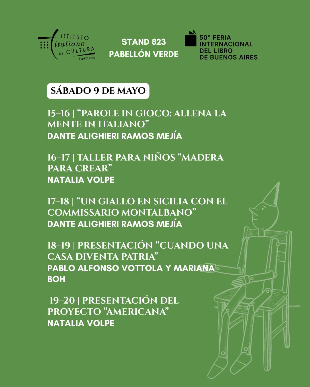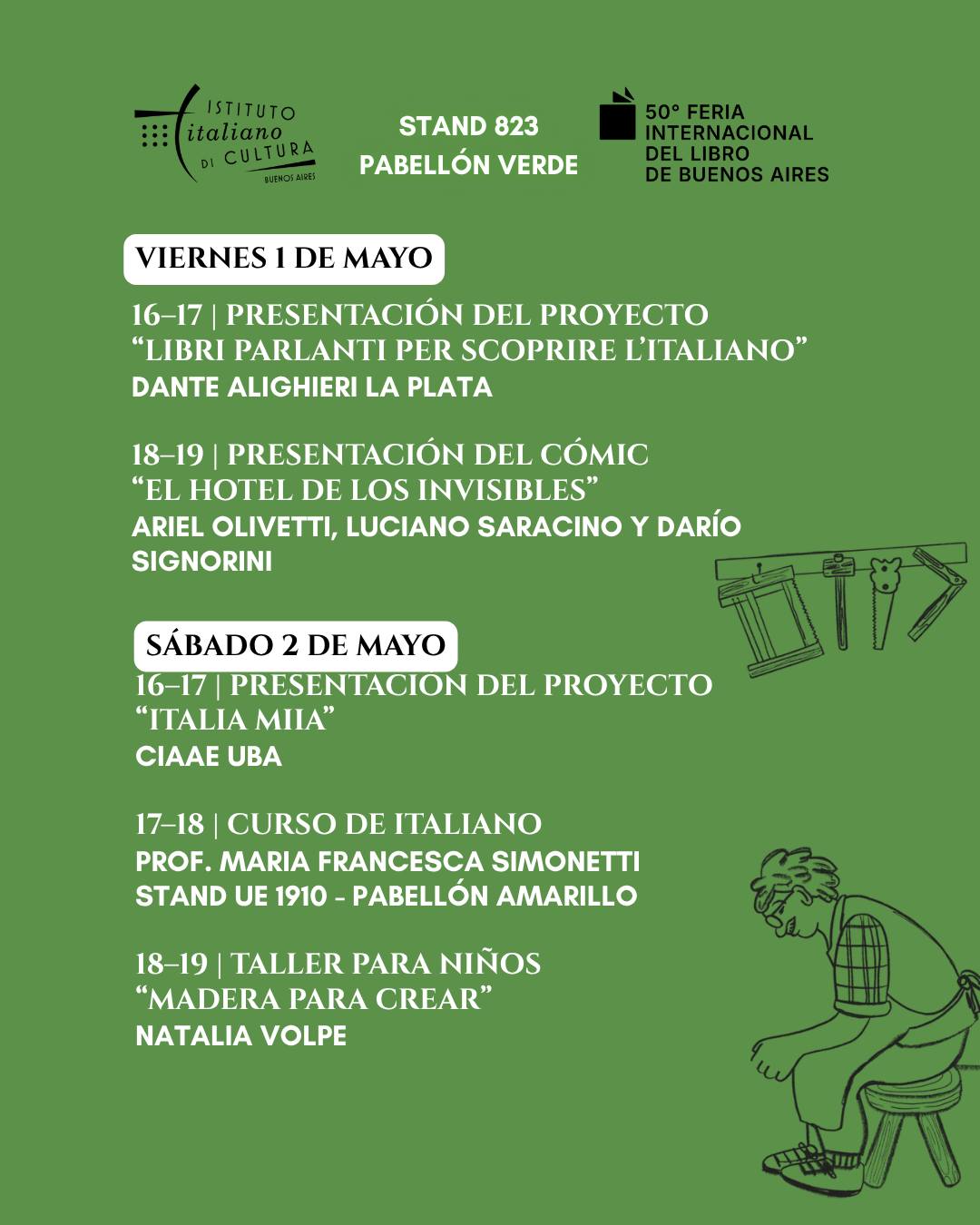 Una hora más tarde, de 17 a 18hs, se llevará a cabo el curso de italiano a cargo de la Prof. Maria Francesca Simonetti, en el Stand UE 1910 del Pabellón Amarillo. De 18 a 19hs, el taller para niños “Madera para crear”, con Natalia Volpe. El domingo 3 de mayo, de 15 a 16hs, se presentará “Caminar la cultura: nuevas formas de mediación entre Italia y Argentina”, a cargo de “Ciencia que anda” y de FEDITALIA. El mismo día de 17 a 18, llega el artista y comunicador Mariano Magnífico con “Buenos Aires: una lengua a la italiana”.