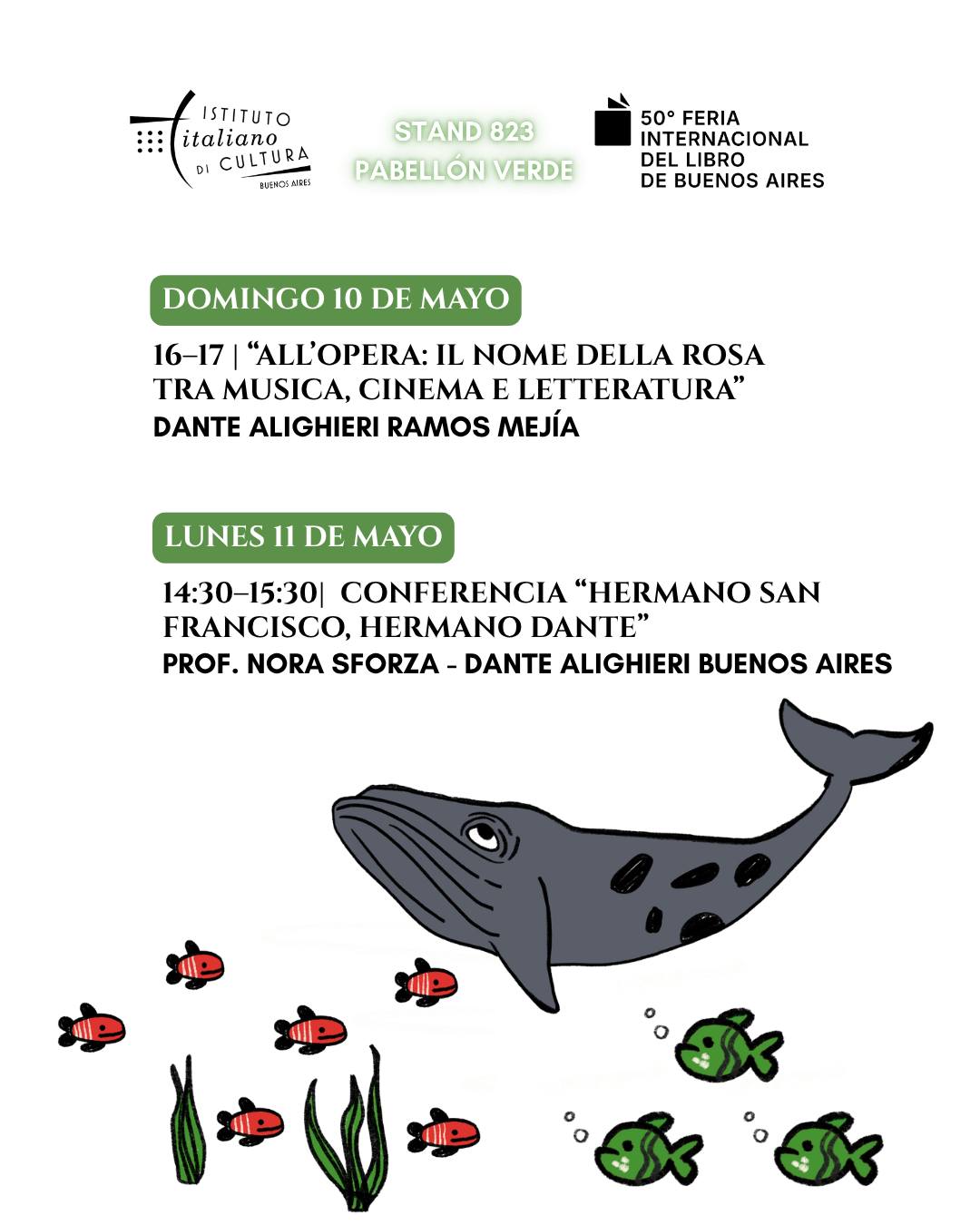 El sábado 9 de mayo ofrecerá una de las jornadas más intensas de toda la Feria. Las propuestas culturales incluyen “Parole in gioco: allena la mente in italiano”, el taller infantil “Madera para crear” y la actividad “Un giallo en Sicilia con el commissario Montalbano”. Hacia la última parte de la tarde, se llevará cabo la presentación “Cuando una casa diventa patria” (con Pablo Alfonso Vottola y Mariana Boh) y el proyecto “Americana”, nuevamente con Natalia Volpe. El cierre de la programación llegará el domingo 10 con “All’opera: Il nome della rosa tra musica, cinema e letteratura” y el lunes 11 de mayo (último día de la Feria del LIbro), de 14.30 a 15.30, con la conferencia “Hermano San Francisco, hermano Dante”, a cargo de la profesora Nora Sforza (Dante Alighieri de Buenos Aires).