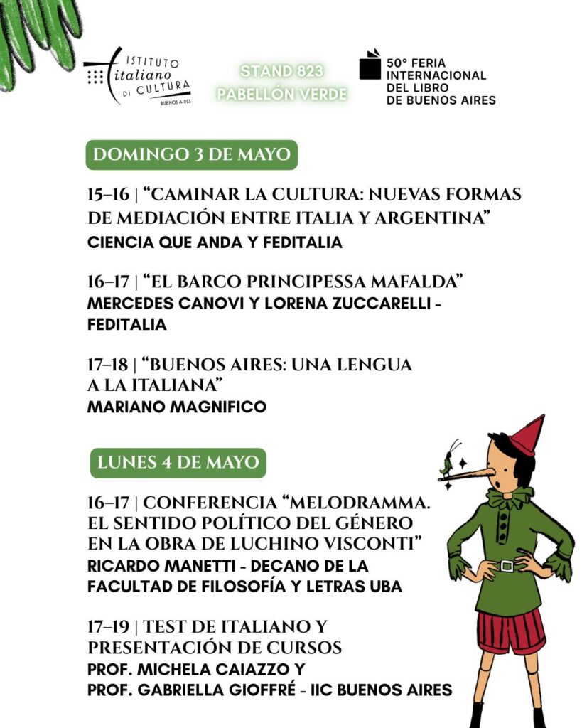 El lunes 4 de mayo será el turno de la conferencia “Melodramma. El sentido político del género en la obra de Luchino Visconti”, a cargo de Ricardo Manetti (Decano de la Facultad de Filosfía y Letras – UBA), junto con un test de italiano y presentación de cursos del Instituto Italiano de Cultura. Las actividades continuarán el martes 5 con una lectura de fragmentos de Pinocho, a cargo de la traductora Alicia Mannucci, y el miércoles 6 con la conferencia “Pinocho: de la mentira a la disciplina”, dictada por la profesora Ariadna García Rivello. El jueves 7 se abordará la figura de Grazia Deledda en la charla “El mar nos separa, la lectura nos acerca”, organizada por la Federación Sarda Argentina, mientras que el viernes 8 se presentará el libro “L’Università per Stranieri di Perugia. Storia di un ateneo aperto al mondo”.