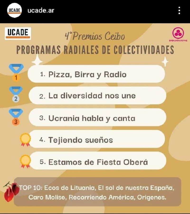 Anualmente la Unión de Colectividades en Argentina para el Desarrollo (UCADE), premia a lo múltiples espacios de difusión, sostén y representación de las diferentes colectividades que hay en este vasto país. Este año, en la categoría de programas radiales, la fortuna señaló a Pizza, Birra, Radio como ganadores con el Ceibo de Oro. “Esto refrenda nuestro compromiso por sostener un espacio de estas características es vital para dar a los jóvenes el lugar que requieren en la colectividad. Es fundamental que las nuevas generaciones encontremos espacios de participación activa y de construcción de la ciudadanía que nos permitan formarnos como actores sociales conscientes”, reflexionó el entrevistado de La Sfogliatella.